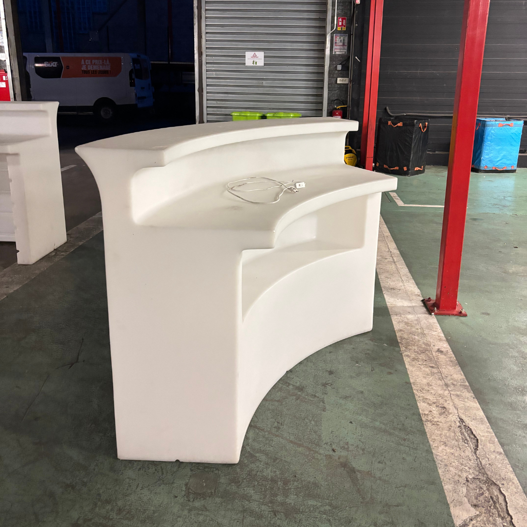 Facile à intégrer dans toutes les configurations événementielles, le comptoir bar arrondi constitue un élément central pour structurer un espace bar, un accueil professionnel ou un point de contrôle, tout en assurant un rendu esthétique et fonctionnel.