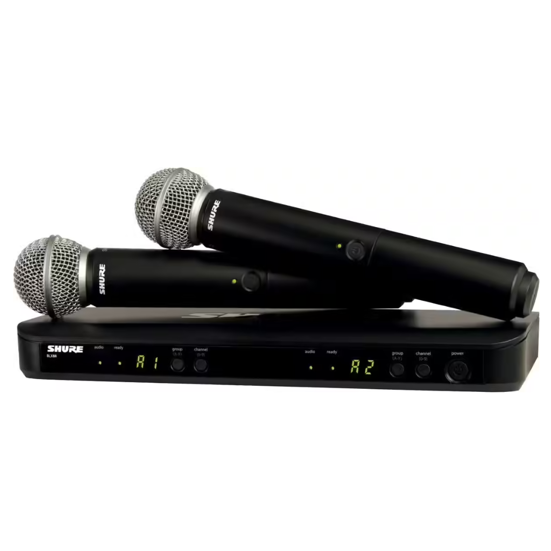 Le Shure BLX288/SM58, également appelé système double micro sans fil, micro HF professionnel ou ensemble micro événementiel, est composé de deux microphones SM58 sans fil associés à un récepteur double canal, offrant une solution fiable pour la sonorisation événementielle.