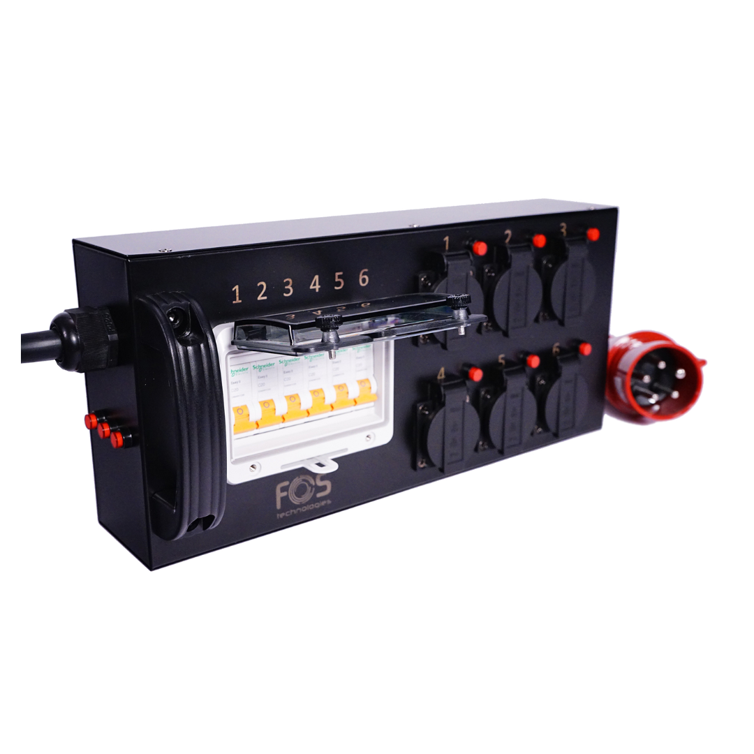 Le Triphasé 32A → 6 prises 32A, également appelé boîtier de distribution triphasé, répartiteur électrique événementiel ou multiprise triphasée professionnelle, est conçu pour les installations électriques événementielles, en intérieur comme en extérieur.